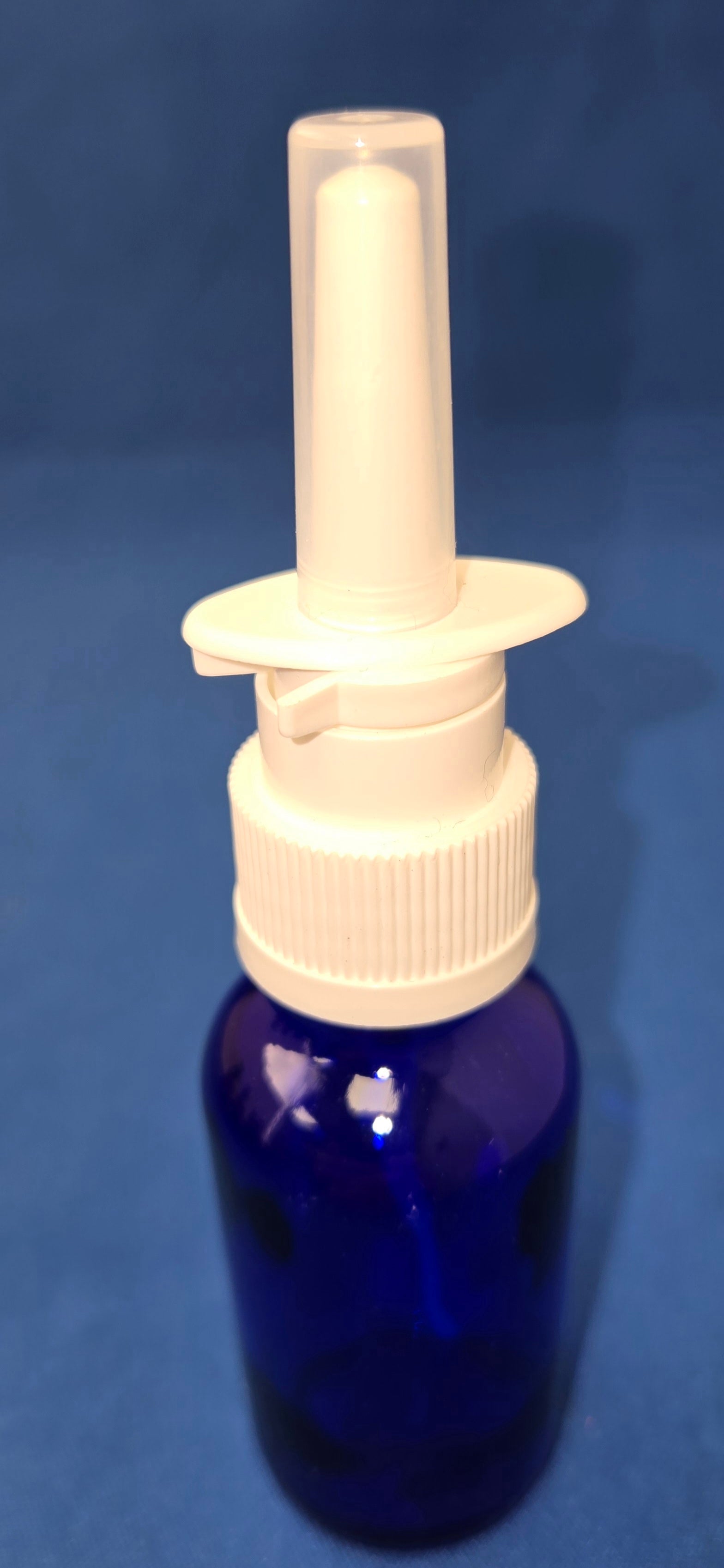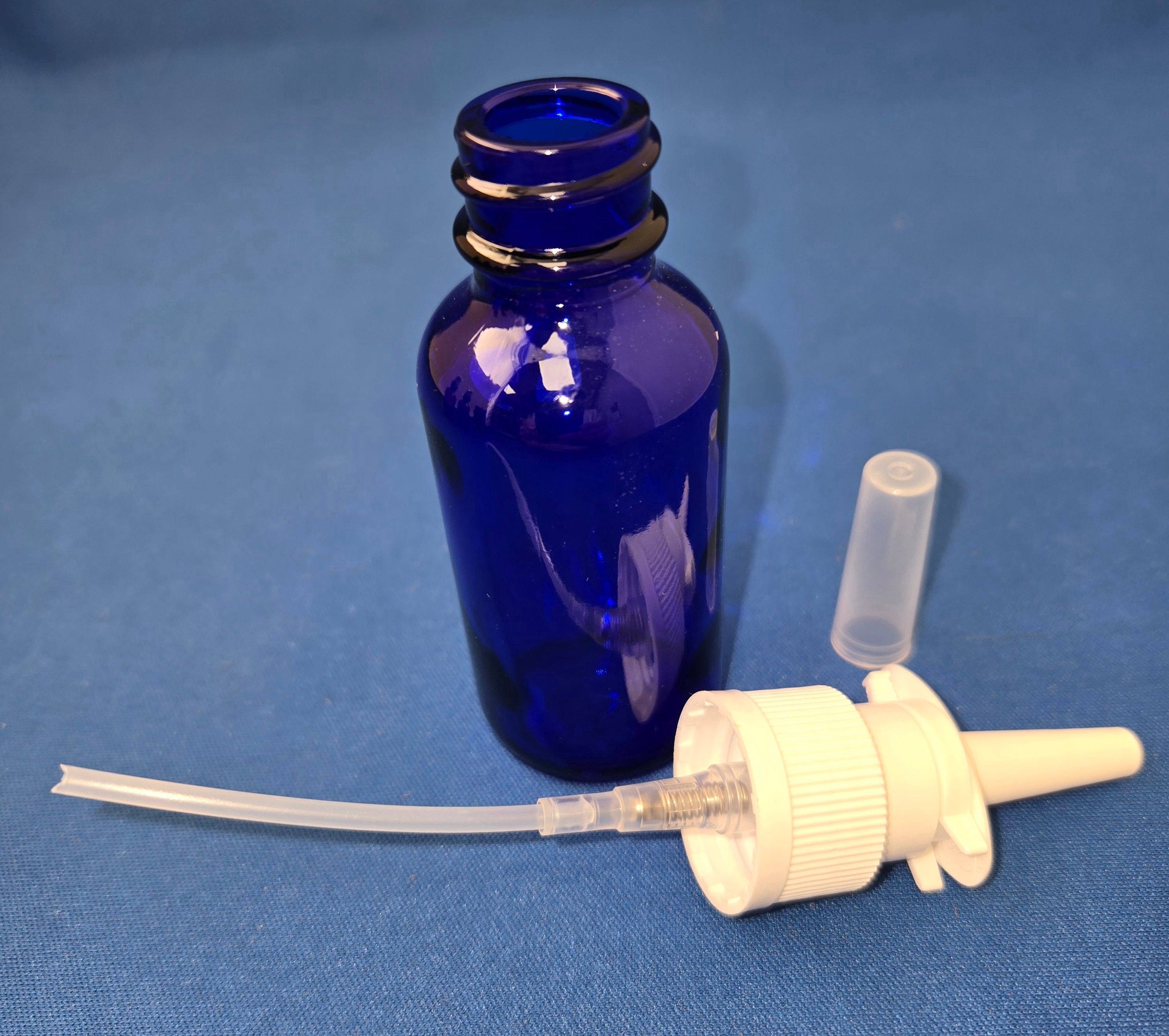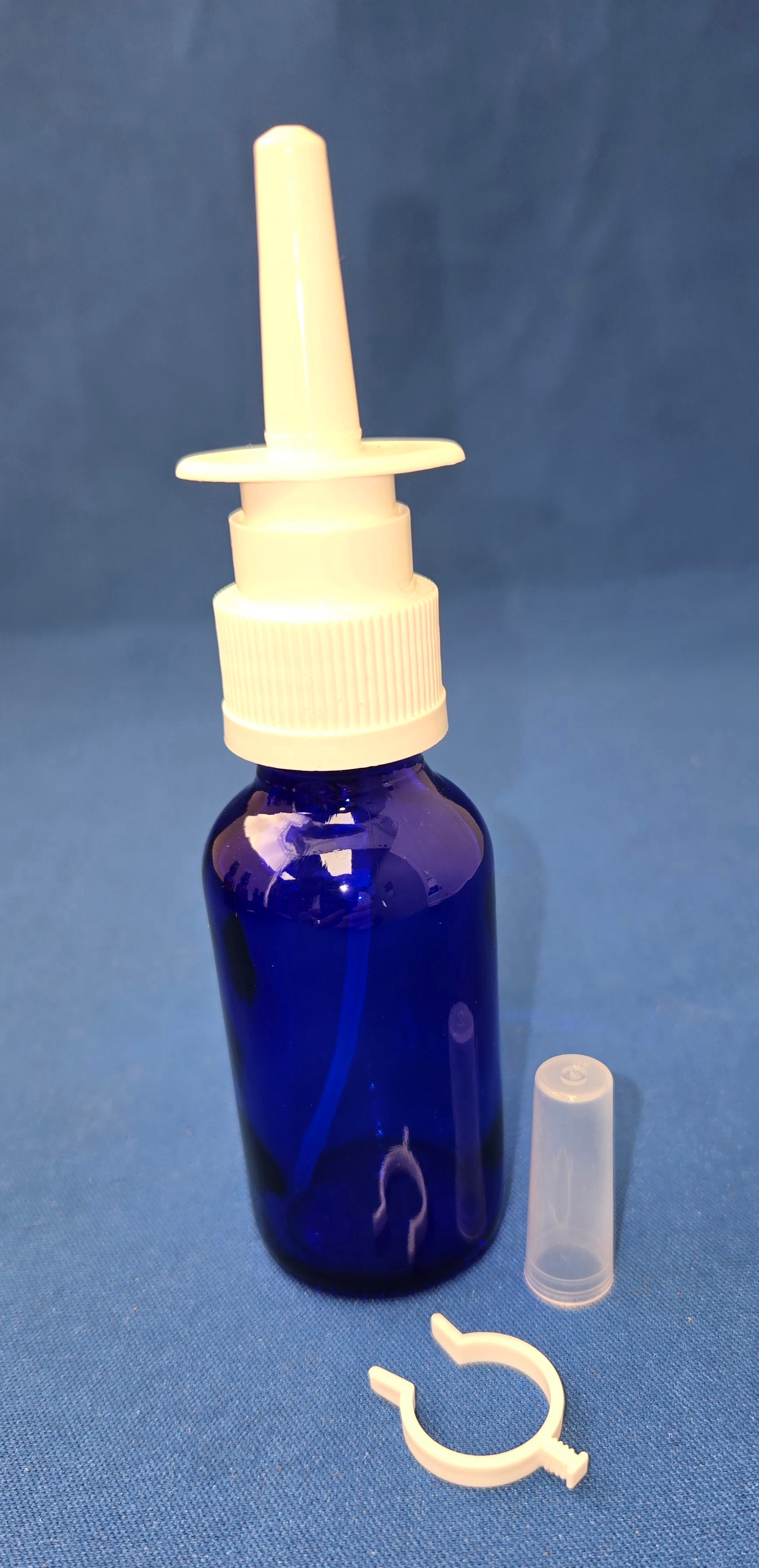 This beautiful cobalt blue glass spray bottle holds 30ml (1 ounce), same size as our standard plastic sprayer. TSA-compliant. Pharma-quality glass bottle with non-corrosive stainless steel pump components. Usable for Colloidal Silver applications as well as Snoot! or Saline Rinses. Nasal sprayer comes with a safety clip and clear protective cap.